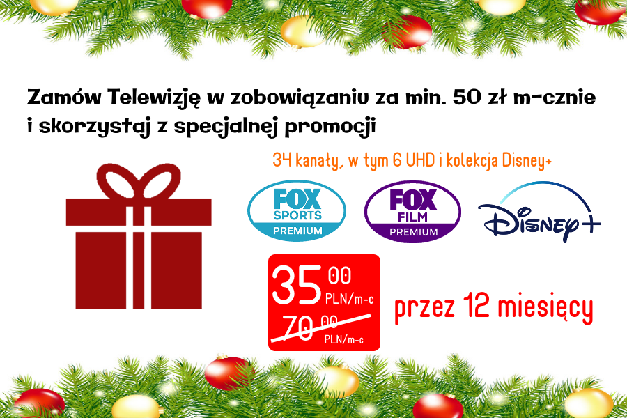 | 1. Podpisz umowę na korzystanie z usługi Telewizja na okres min. 24 miesięcy. 2. Wybierz zestaw Pakietów (Podstawowe+ Dodatkowe), z zobowiązaniem miesięcznym na abonament za usługę za min. 50 zł/m-c (z wyłączeniem Pakietów Promocyjnych przyznanych na okres krótszy niż 24 miesiące, z uwzględnieniem opłat za Pakiety stanowiących stałe zobowiązanie po okresie promocyjnym na cały okres Umowy zgodnie z cennikiem określonym w Umowie) |